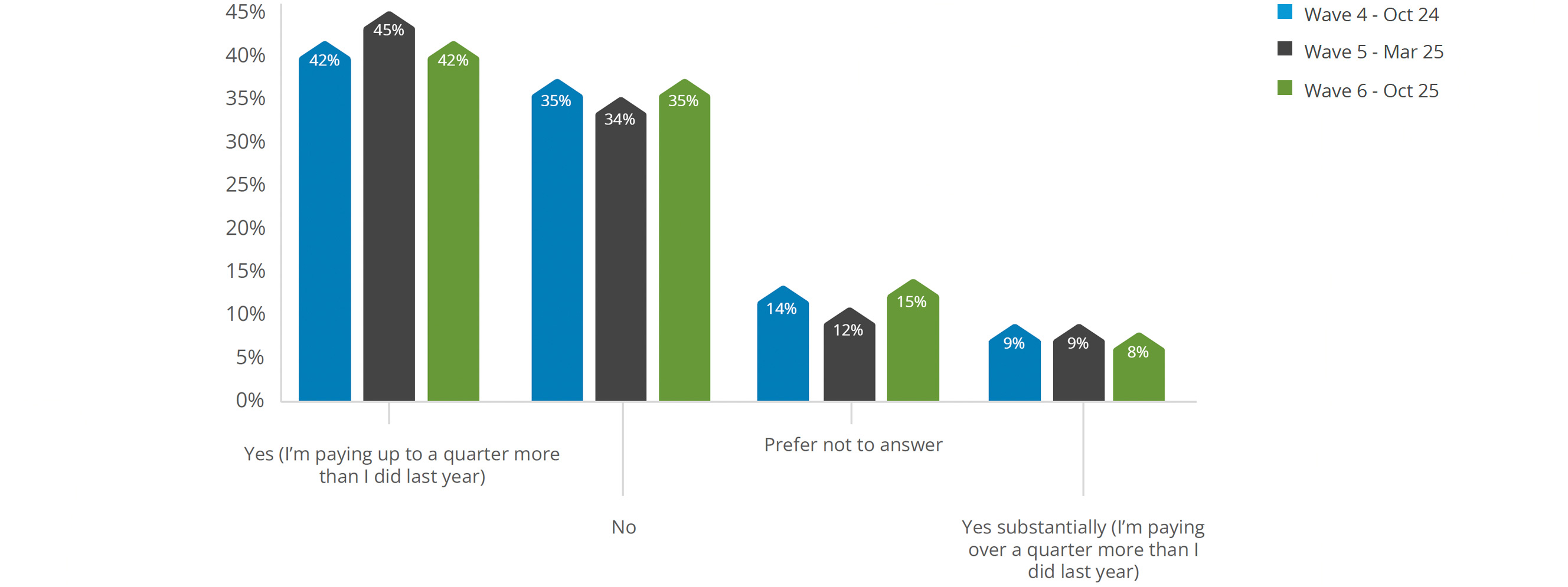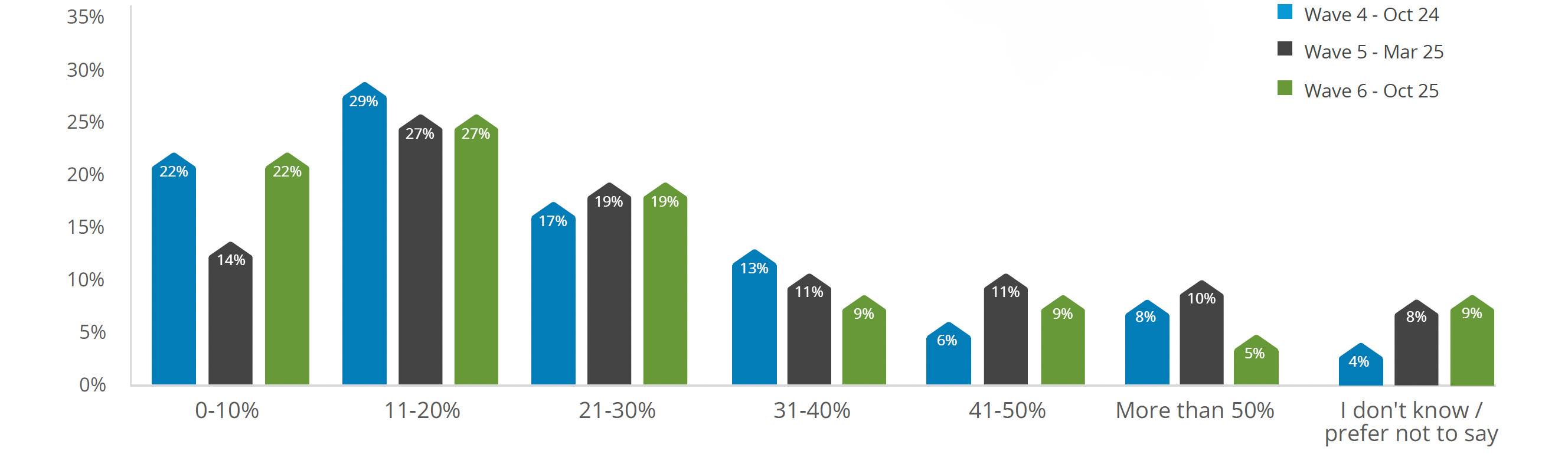 Of those having to pay higher rent, the rate of increase largely stayed the same, with the only increase being in the 0-10% of previous rent, up 8% to 22% compared to March. Rent increases of over 50% fell 5% in the same wave.