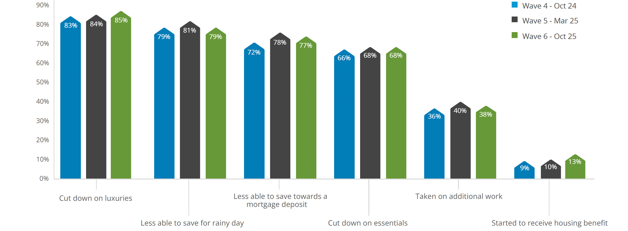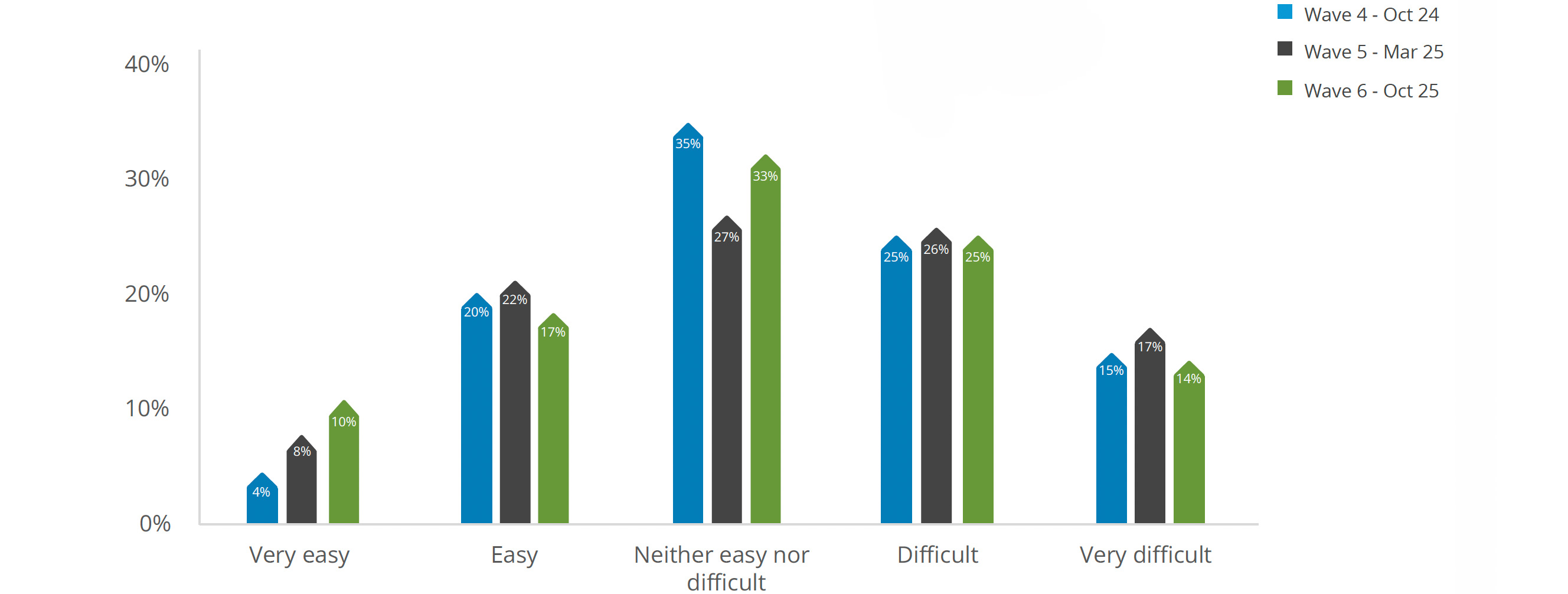 This graph shows tenant experiences of securing the property. In our latest wave, 27% found it neither easy nor difficult to secure their property, although 43% of tenants found it difficult or very difficult.